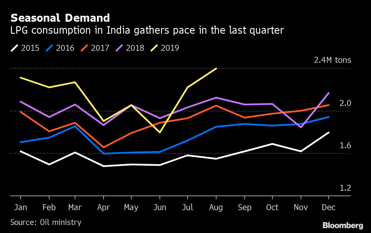 India, the world’s second-largest LPG importer, gets about half of its requirements from foreign suppliers, mostly from Middle Eastern producers in Saudi Arabia, Qatar, Oman and Kuwait. Demand for the fuel typically climbs after the monsoon season ends in around September, and festive season begins in the fourth quarter. Seasonality aside, the nation’s demand has also received a boost from Prime Minister Narendra Modi’s plans to link poorer communities to LPG supply networks in efforts to reduce the use of pollutive fuels such as wood and cow dung.