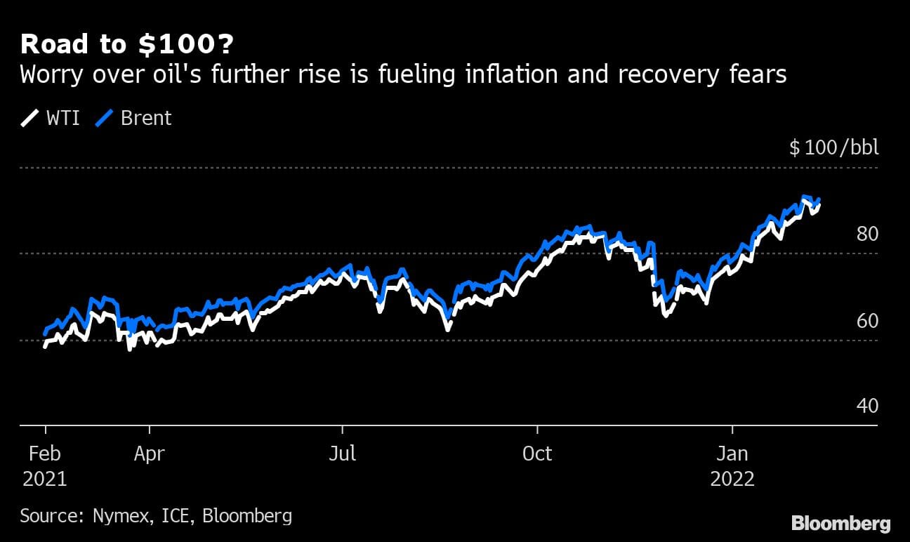 According to Bloomberg Economics’ Shok model, a climb in crude to $100 by the end of this month from around $70 at the end of 2021 would lift inflation by about half a percentage point in the U.S. and Europe in the second half of the year.