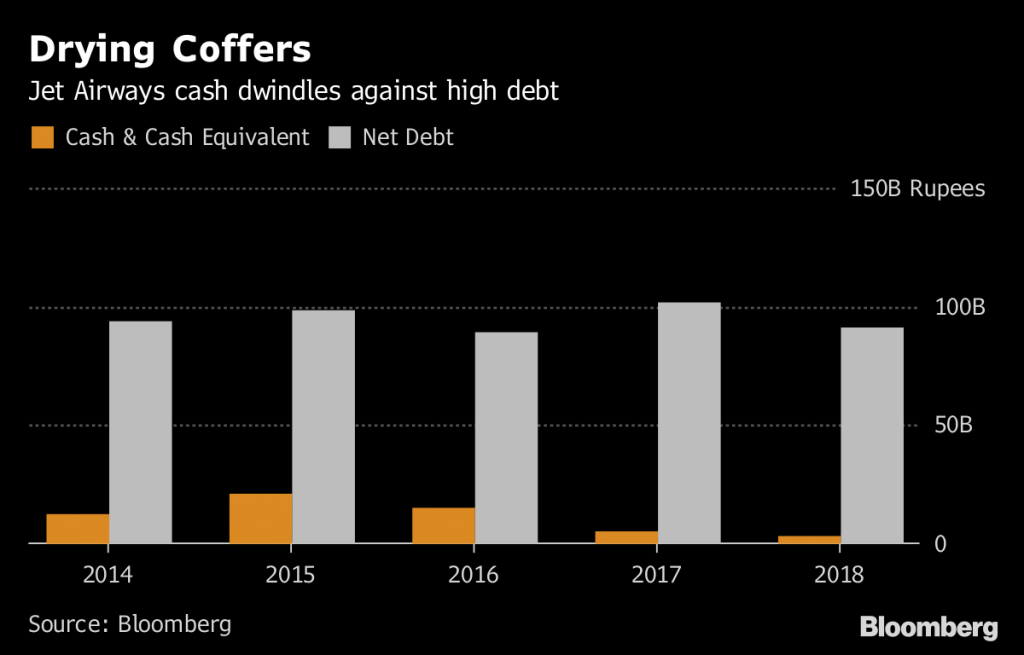 Mumbai-based Jet Airways had total debt of 94.3 billion rupees ($1.4 billion), and cash and equivalents of 3.2 billion rupees for the year ended March 31, 2018, according to Bloomberg-compiled data. The firm’s total debt ballooned to 55.4 times earnings before interest and tax as of March 31, compared to 4.9 times the previous year, the data showed.