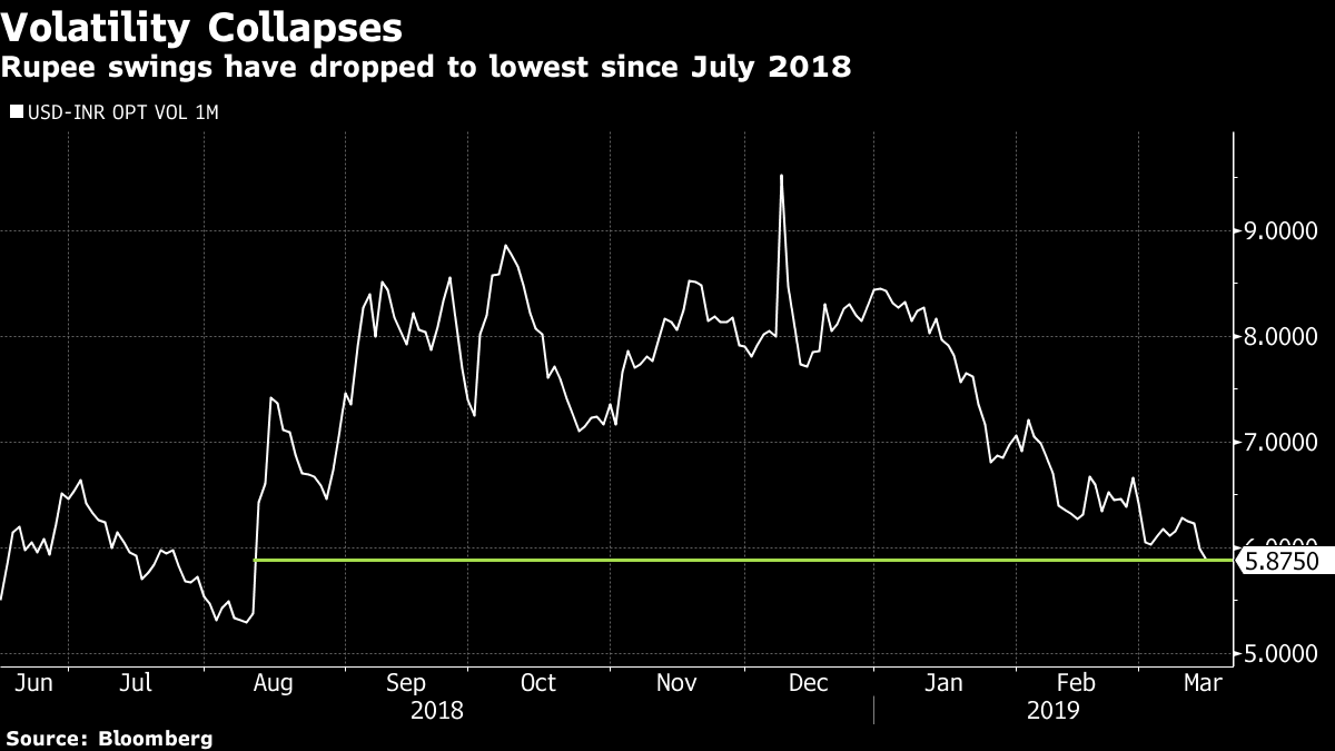 The rupee’s three-month implied volatility, a gauge of expected swings used to price options, fell to 5.87 percent on Friday, the lowest reading since August.