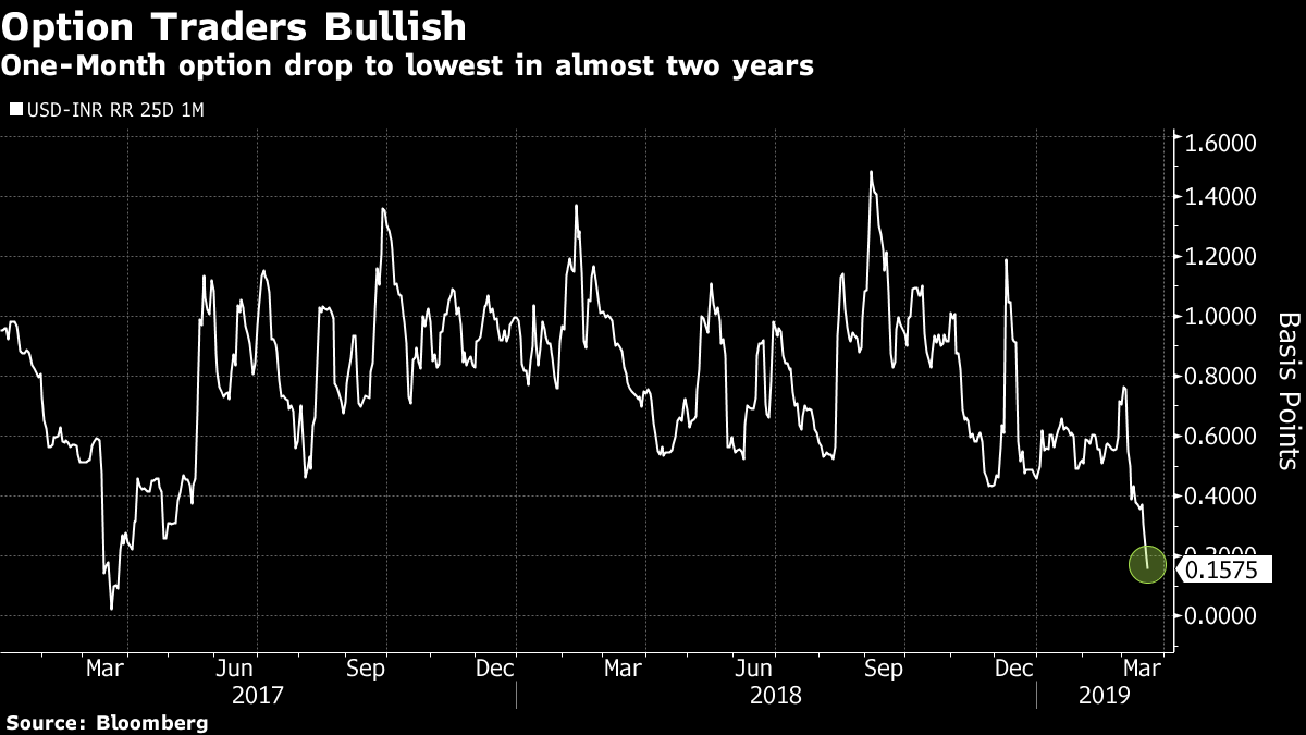 The rupee optimism is also reflected in the derivatives market, where one-month options conferring the right to sell the rupee now cost 19 basis points more than those to buy. That’s down from 148 on Sept. 5, which was the highest since November 2016.