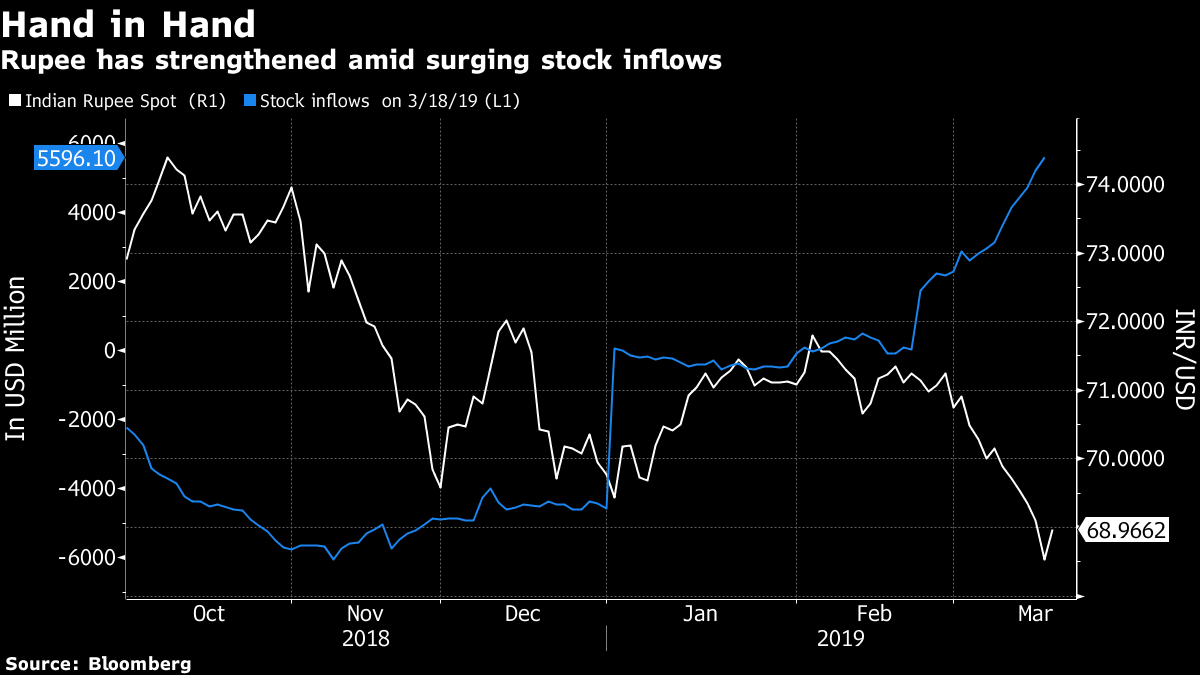 Foreigners bought a net $3.3 billion of shares through March 18, accounting for more than half the $5.6 billion of inflows year-to-date, and raised holdings of bonds by $1.4 billion this month. The gush of dollars sent the rupee to its highest level since August, prompting profit-booking that saw the currency posting its first drop in seven sessions on Tuesday.