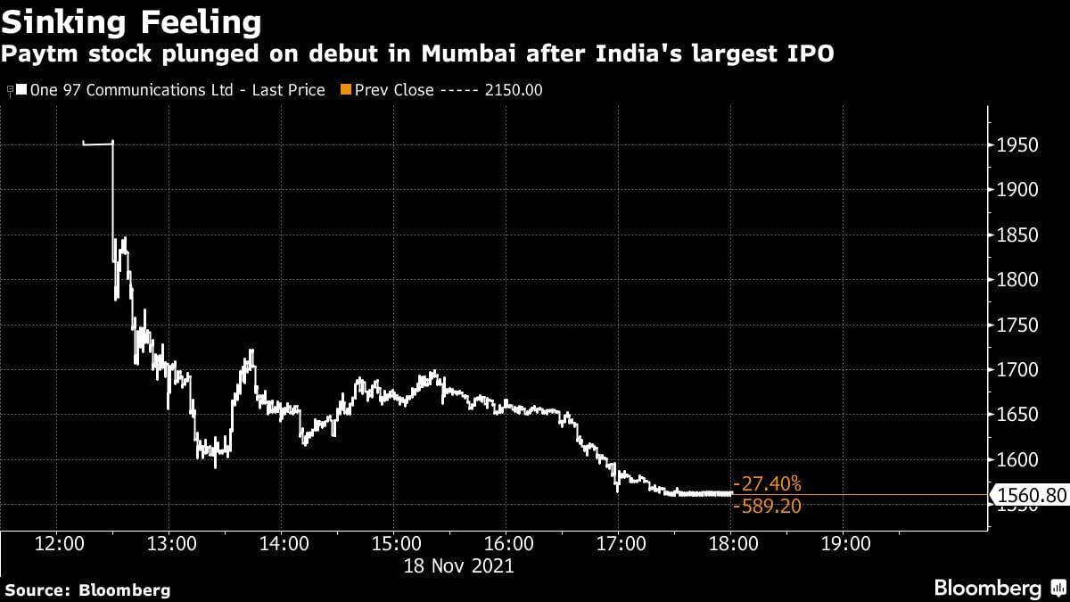 Paytm and its backers then stretched its valuation during the IPO process, underestimating the importance of solid demand from retail and institutions, according to bankers familiar with the matter. It priced shares at 2,150 rupees a piece, at the top end of its range. In an early sign of trouble, the IPO wasn’t fully subscribed the first days that shares were offered — a rarity for deals in red-hot India.