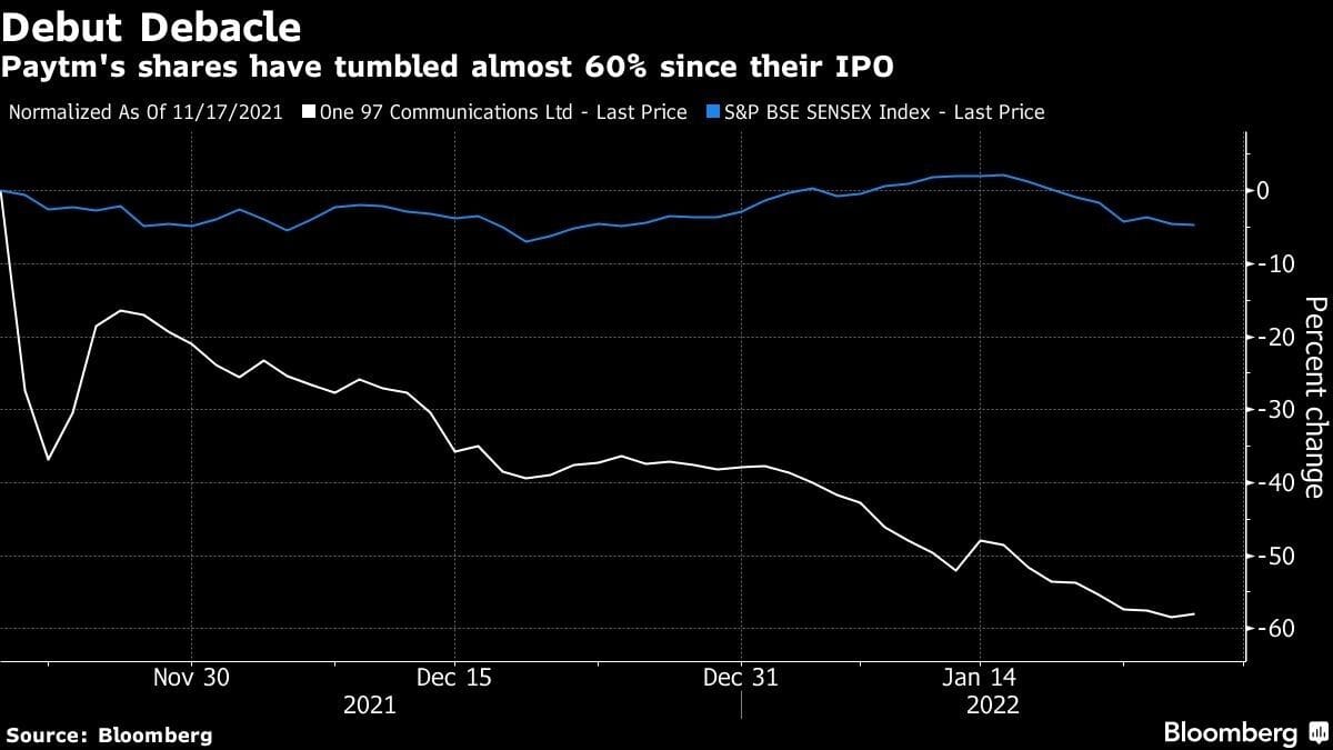 Paytm shares have tumbled 58% since the stock listed on Nov. 18. That’s cut the valuation of its parent One 97 Communications Ltd. to $7.8 billion from $20 billion.