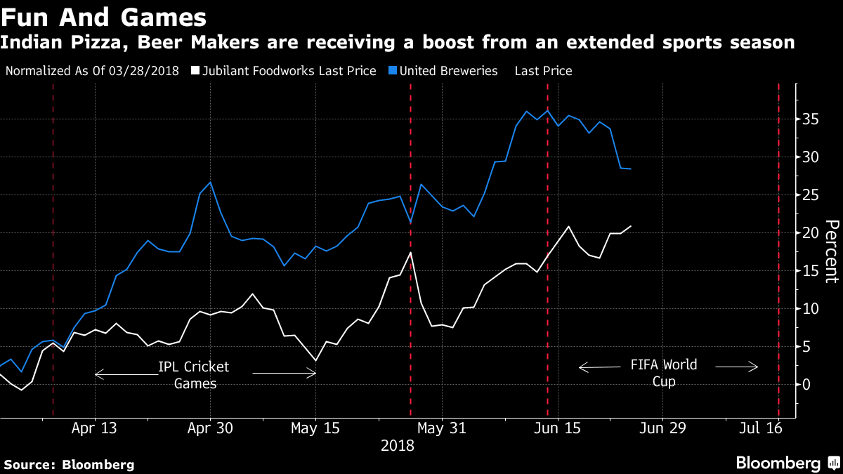 The World Cup, which began weeks after the Indian Premier League cricket season ended in May, has prolonged the dream run for Jubilant Foodworks Ltd., which operates the local franchise of Domino’s Pizza Inc., and Kingfisher beer owner United Breweries Ltd.