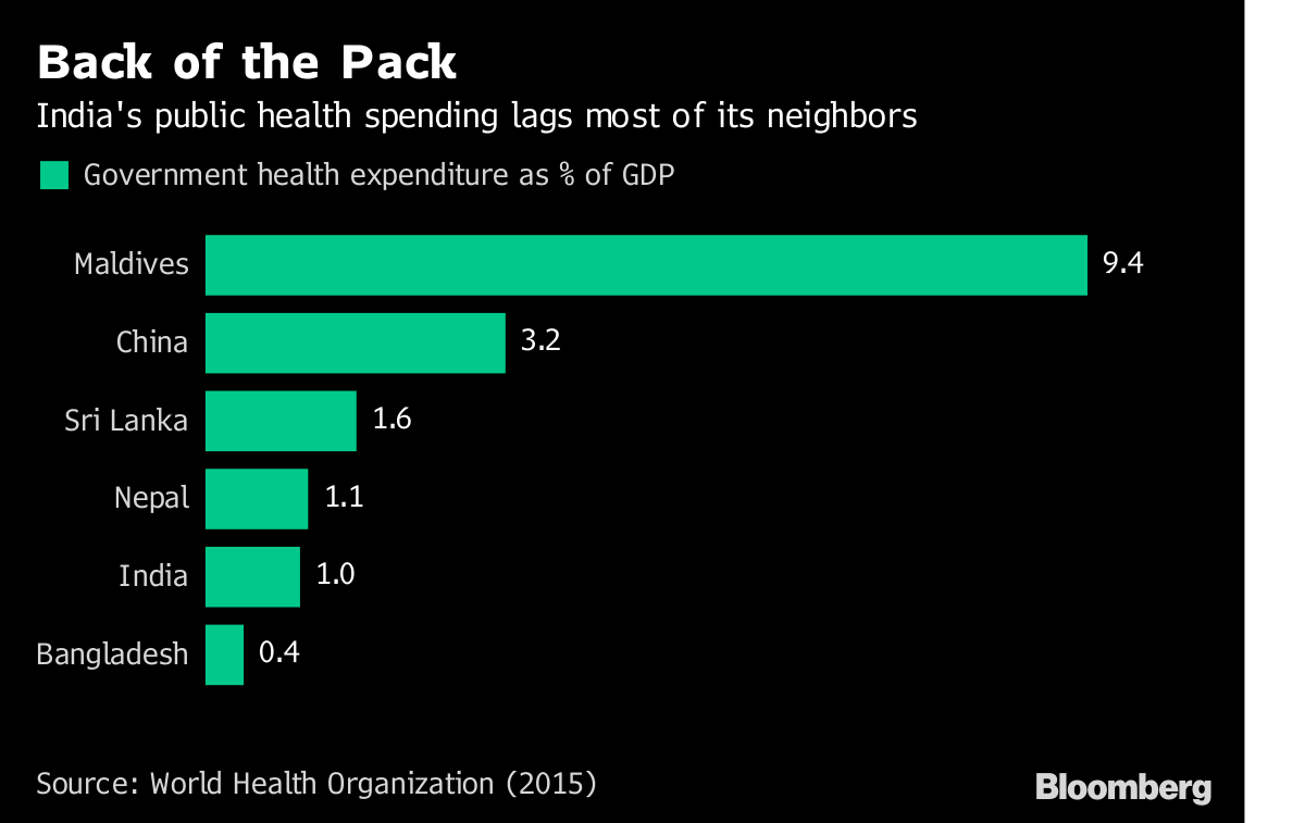 Spending on health pushed more than 52 million people below the poverty line in India, according to a 2017 World Health Organization report. The world’s-fastest growing economy spends about 1 percent of its gross domestic product on healthcare and aims to increase it to 2.5 percent by 2025 but has to overcome challenges from poor health facilities.