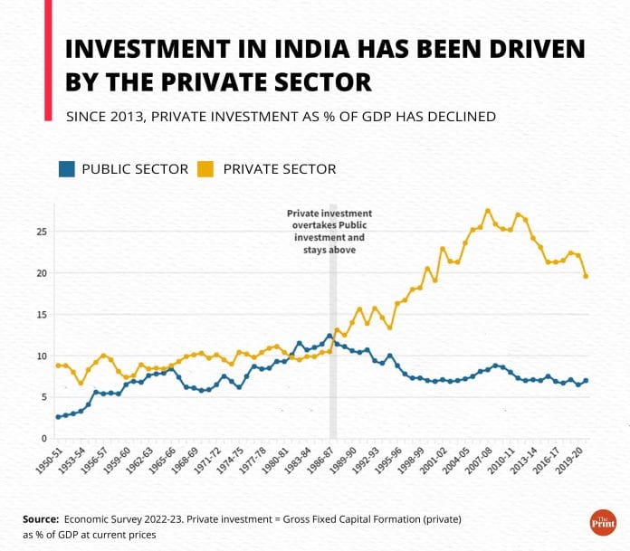 Analysis of data from the latest Economic Survey of 2022-23 shows that private investment has exceeded investment by the government as a percentage of GDP since 1950 (except for a brief period in the 1980s).