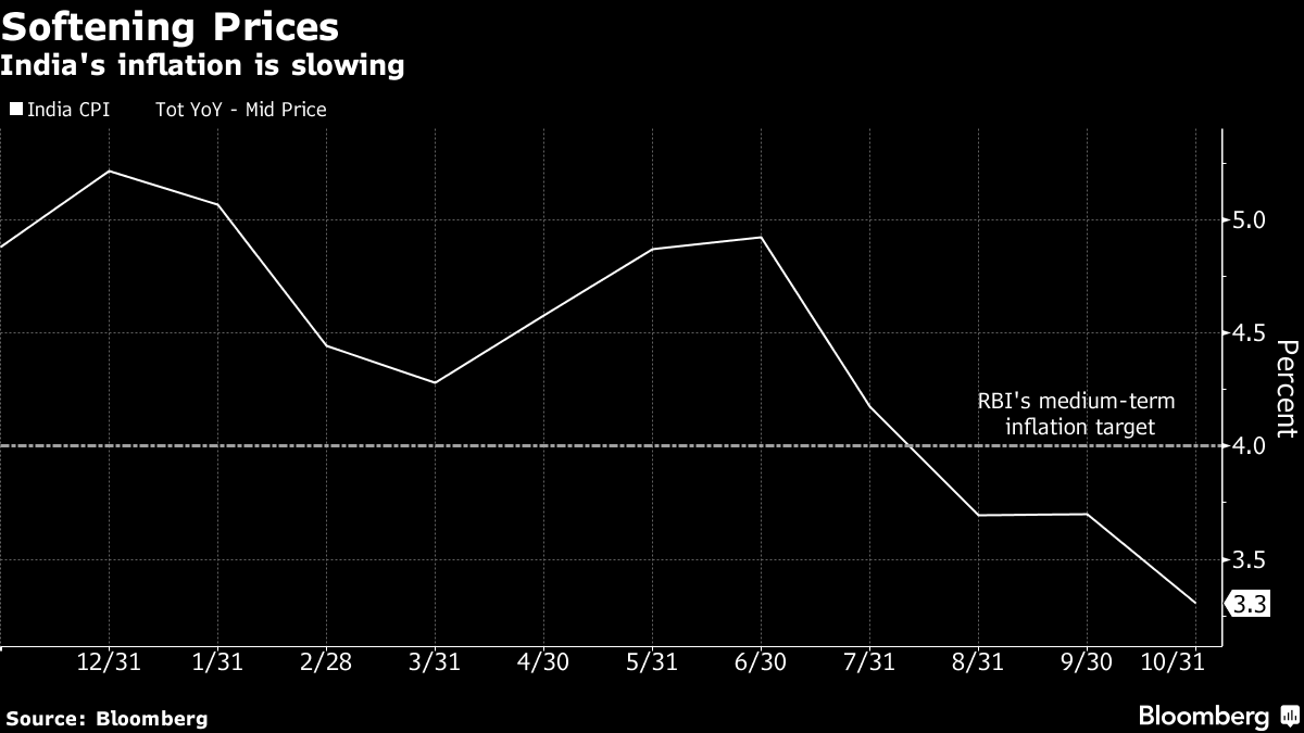 The comments come at a time when inflation continues to undershoot the RBI’s forecasts. Inflation averaged 4.3 per cent in the six months of the fiscal year through September, below the RBI’s range of 4.7 per cent to 5.1 per cent from its April monetary policy statement. At 3.31 per cent in October, inflation is already underneath the 3.9 per cent lower end of the range for the second half. The RBI’s target is to keep inflation at 4 per cent over the medium term.