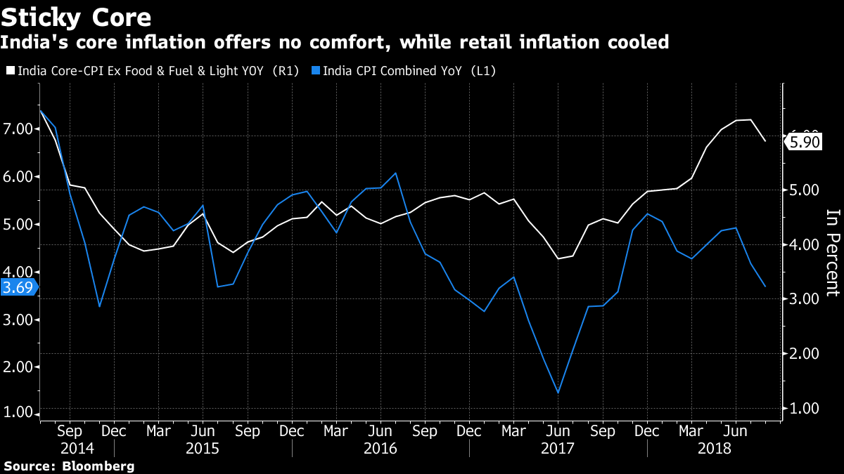 While headline inflation has eased in recent months, the core measure, which strips out volatile fuel, food and electricity prices, has been sticky at around 6 per cent. The RBI forecasts consumer-price growth will accelerate to 4.8 per cent in the first quarter of the fiscal year 2020.