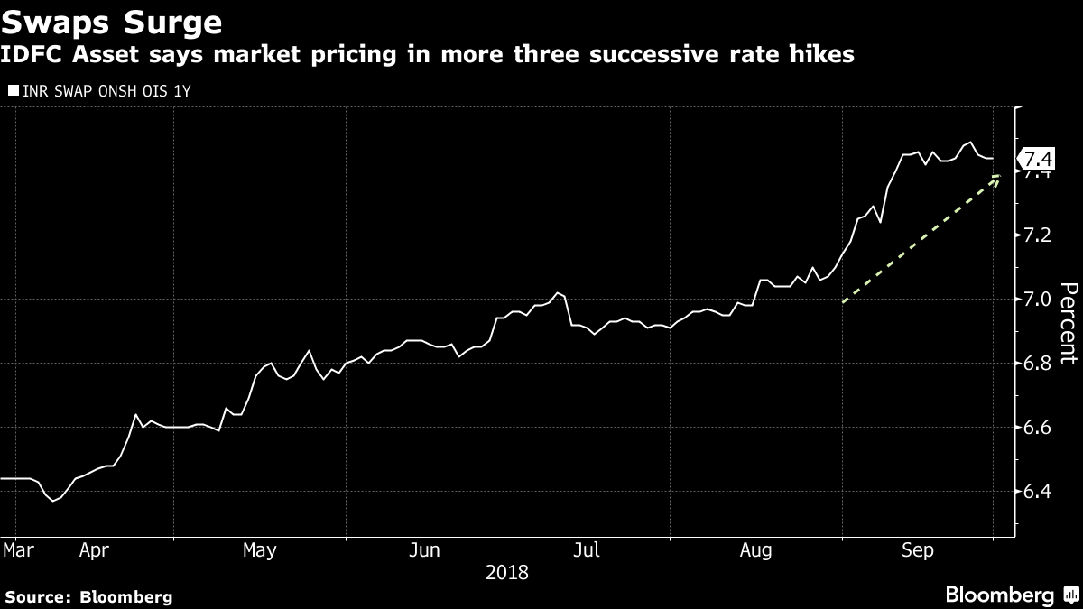IDFC Asset prefers sovereign papers maturing in five years and AAA corporate bonds as the “best trades to play the fade in excess tightening expectations that are being built in,” Choudhary said. He is cautious on lower-rated and high-carry strategies as the IL&FS crisis has led to a spike in short-term rates and begun to stress financing plans.
