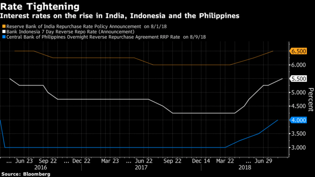 India isn’t alone in Asia in raising rates to curb inflation and stem foreign outflows. Indonesia has increased rates four times since May while the Philippines has tightened as well.