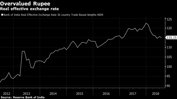 Some officials like Rajiv Kumar, vice chairman of the government think-tank NITI Aayog, have maintained that the rupee is overvalued on a real effective exchange rate level. A 36-country trade-weighted index of the exchange rate dropped to 115.15 in July from 120.02 a year ago, central bank data shows. A level higher than 100 suggests an over-valuation of the exchange rate, while a level below that suggests undervaluation.-Bloomberg