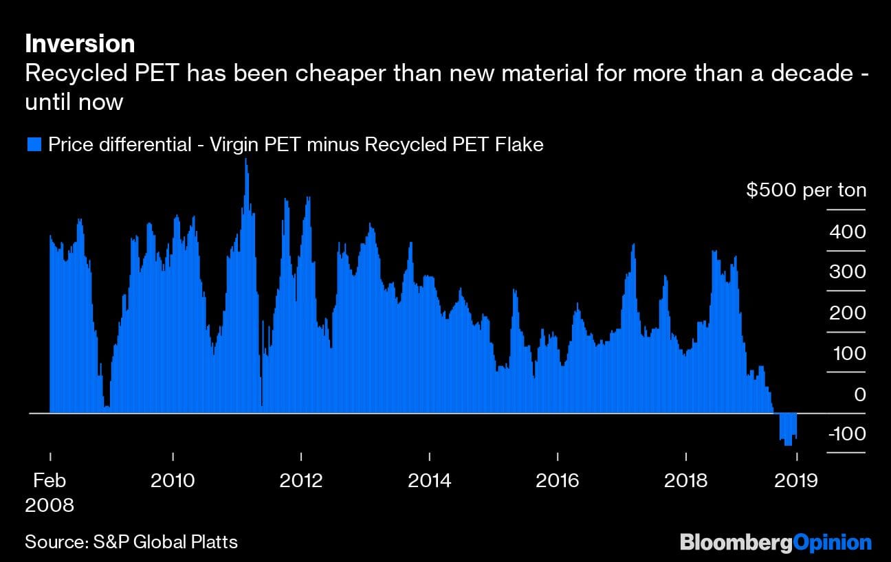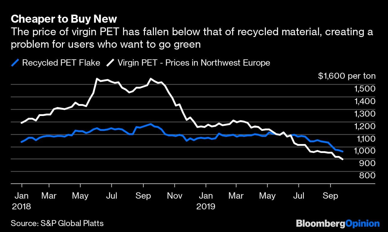 The cost of brand new polyethylene terephthalate, or virgin PET (the stuff used to make plastic containers and fibers for clothing), fell below the cost of recycled PET earlier this year, according to a report published last week by S&P Global Platts. It could well stay there for a while, and that might test bottle-makers’ resolve to boost the share of recycled plastic in their products.