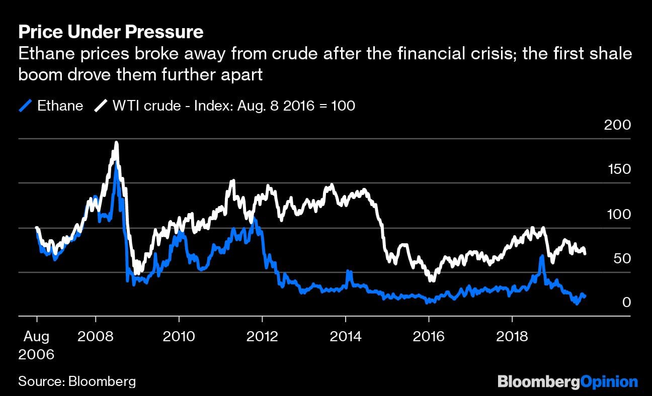 That boom has had a dramatic impact on prices. Ethane moved in parallel with crude oil until after the 2008 financial crisis, when it lagged behind the subsequent oil price recovery. The shale boom triggered another fall in ethane’s pricing relative to crude.