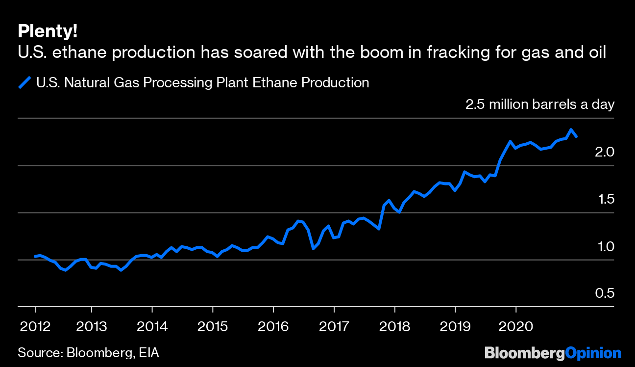The U.S. shale boom has yielded vast quantities of petrochemicals feedstock and the supply won’t dry up any time soon, putting constant downward pressure on the price of new plastic. Production of ethane (a major feedstock for plastic) reached 1.9 million barrels a day in March, according to the U.S. Energy Information Administration, almost double what it was in 2012. It’s set to rise by another 500,000 barrels a day next year.