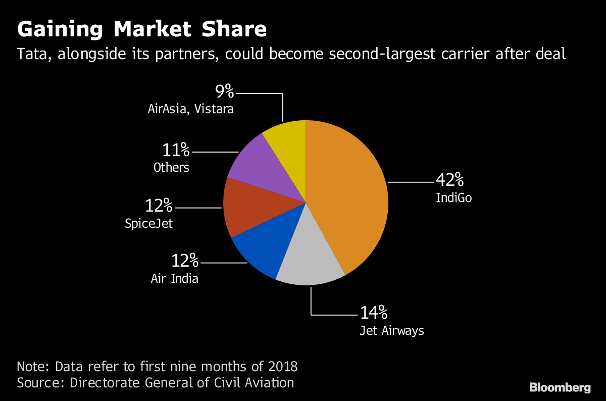 Tata already has two aviation joint ventures: one with Singapore Airlines Ltd. called Vistara, and another with AirAsia Group Bhd. A successful deal would catapult the Tata Group’s fledgling aviation business to India’s biggest after IndiGo. One option is to combine Jet Airways with Vistara, said one of the people.