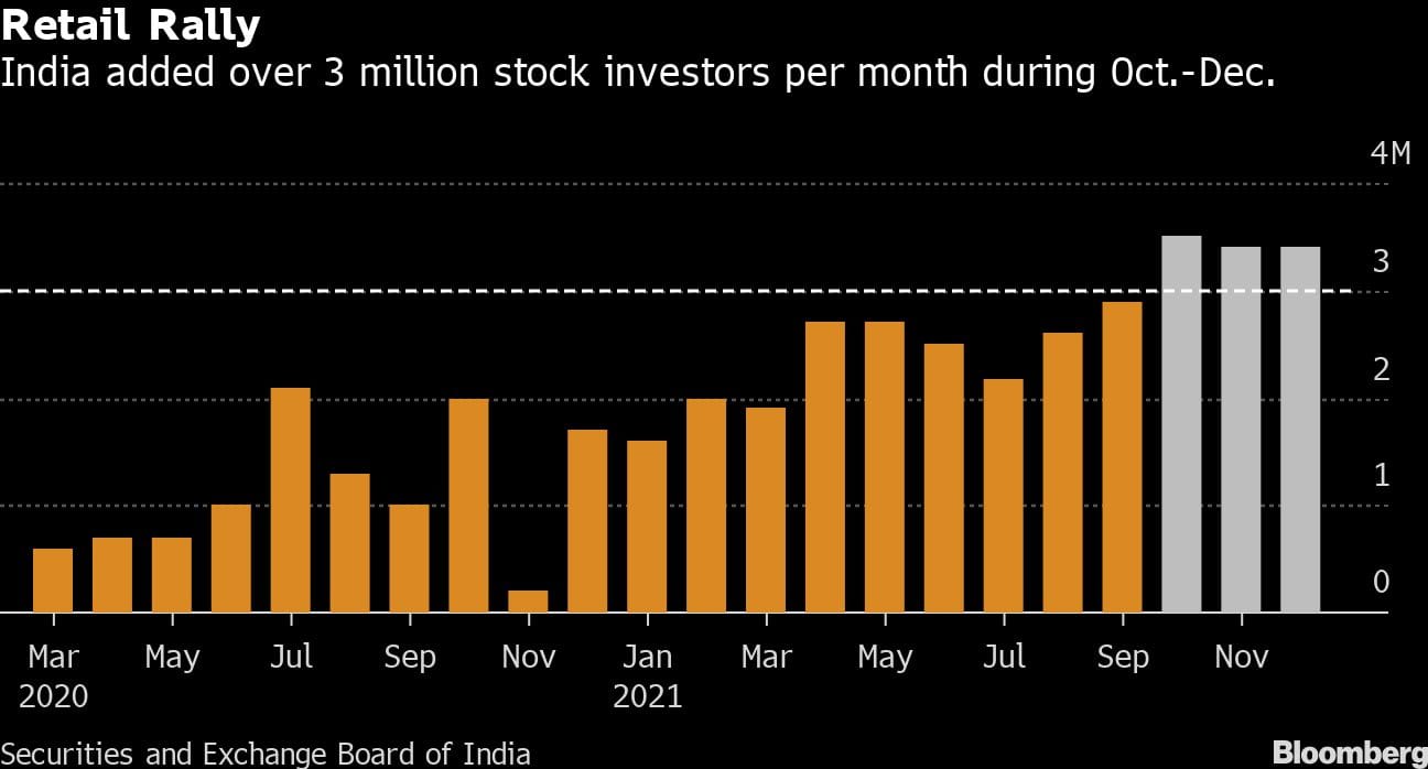 Individuals opened an all-time high of 31 million stock-trading accounts during 2021 — more than Australia’s entire population — according to data released at the end of January by the Securities & Exchange Board of India. The pace accelerated to over 3 million per month in the last quarter, even as selling by overseas traders pushed the S&P BSE Sensex toward a technical correction.