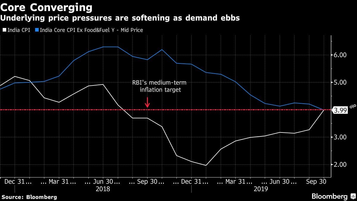 “We expect the RBI to maintain its easing bias on the back of sluggish growth, and weak generalized inflation pressures,” said Teresa John, an economist at Nirmal Bang Equities Pvt., who sees a 15 basis-point cut at the next policy meeting in December. Should growth numbers “surprise substantially on the downside below 5%, we would not rule out a large rate cut.”
