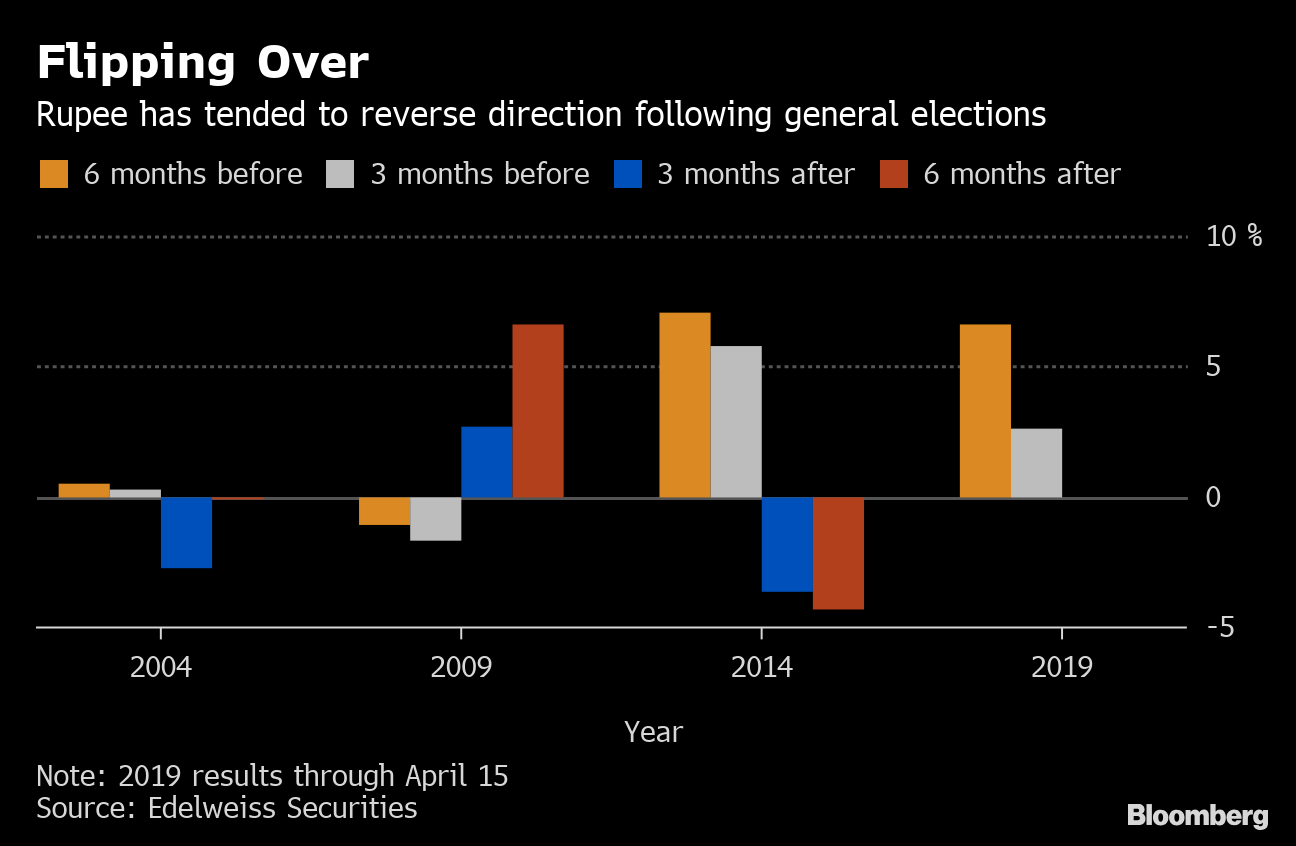 The currency has shown a tendency to flip directions after polls have been completed, according to a study by Edelweiss Securities Pvt, based on the past three election cycles. The currency has tended to reverse course when it has rallied ahead of the vote, said Madhavi Arora, an economist at the brokerage in Mumbai.