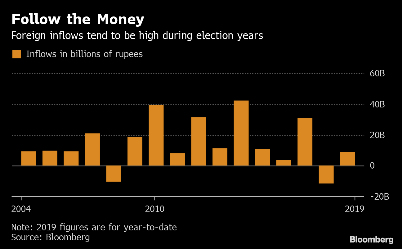History also shows election years tend to see increased inflows from overseas. While foreign buying will depend on a mix of factors, including global developments, the influx seen during past election cycles provides some scope to be optimistic, according to Deutsche Bank AG, which may help the rupee.