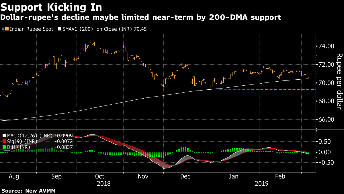 USD/INR’s MACD has turned bearish (which is INR bullish) with it below zero and signal line Further rupee gains maybe limited in the near term due to USD/INR support at 200-DMA, currently at 70.58, and an additional support at 69.230, the Jan. 7 low