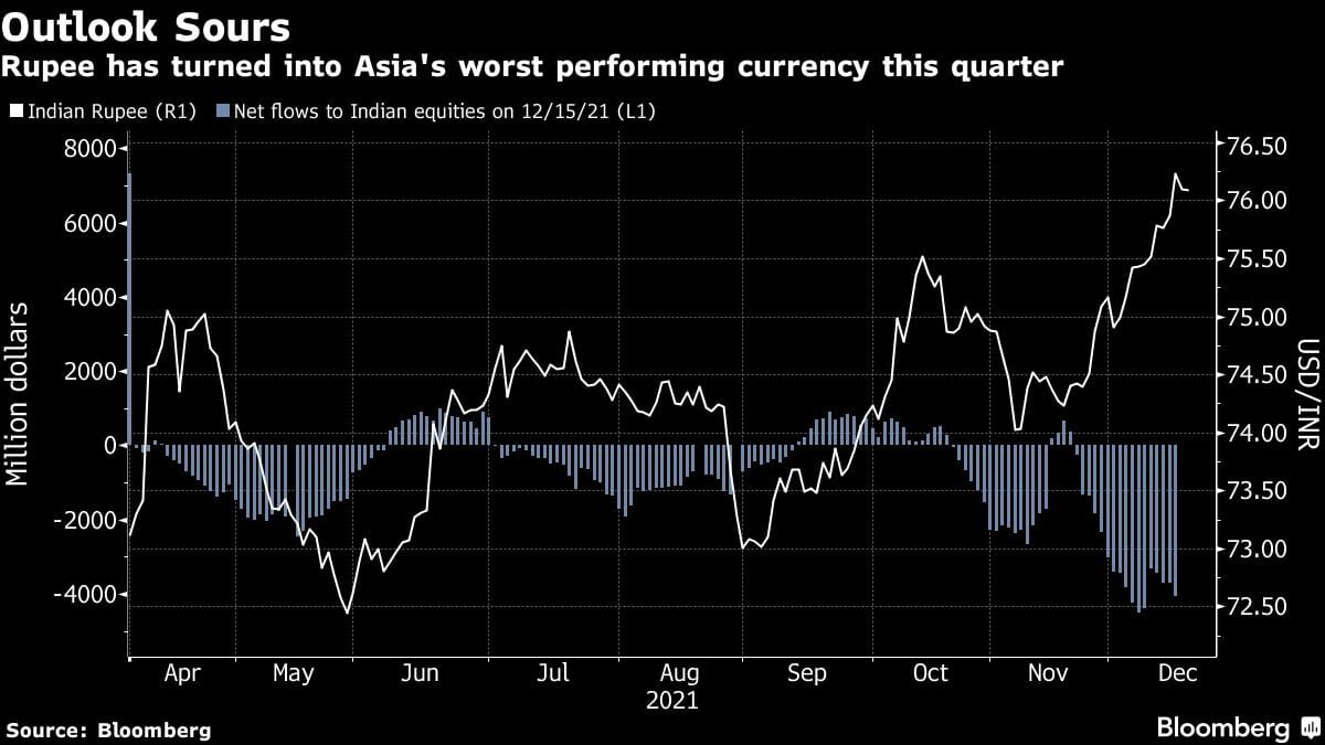 Foreigners sold Indian stocks as Goldman Sachs Group Inc. and Nomura Holdings Inc. recently lowered their outlook for equities, citing lofty valuations, at a time when concerns about the omicron virus variant are roiling the global markets. Record-high trade deficit and the central bank’s policy divergence with the Federal Reserve have also impinged on the rupee’s carry appeal.
