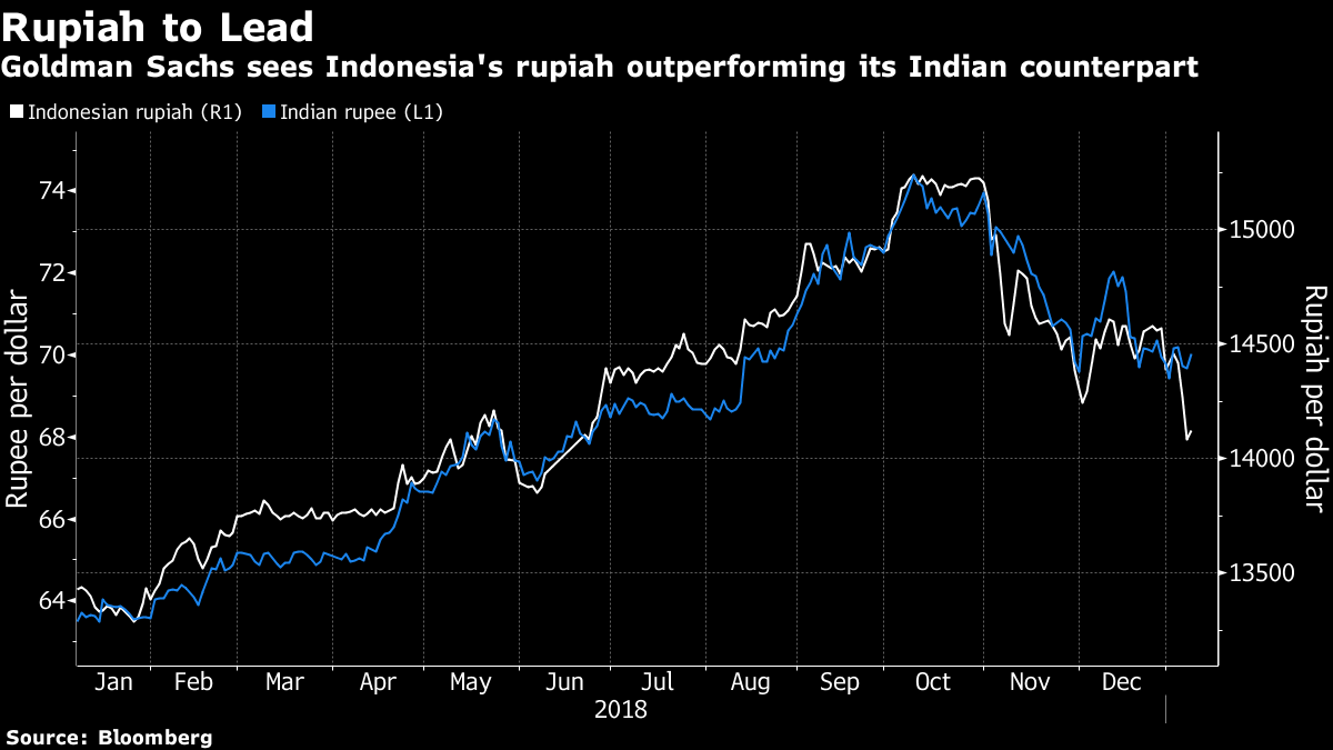 Singapore: Indonesia’s rupiah is set to outperform the Indian rupee, thanks to the diverging impact of oil prices, portfolio flows and monetary policy sensitivities to the Federal Reserve, according to Goldman Sachs Group Inc.