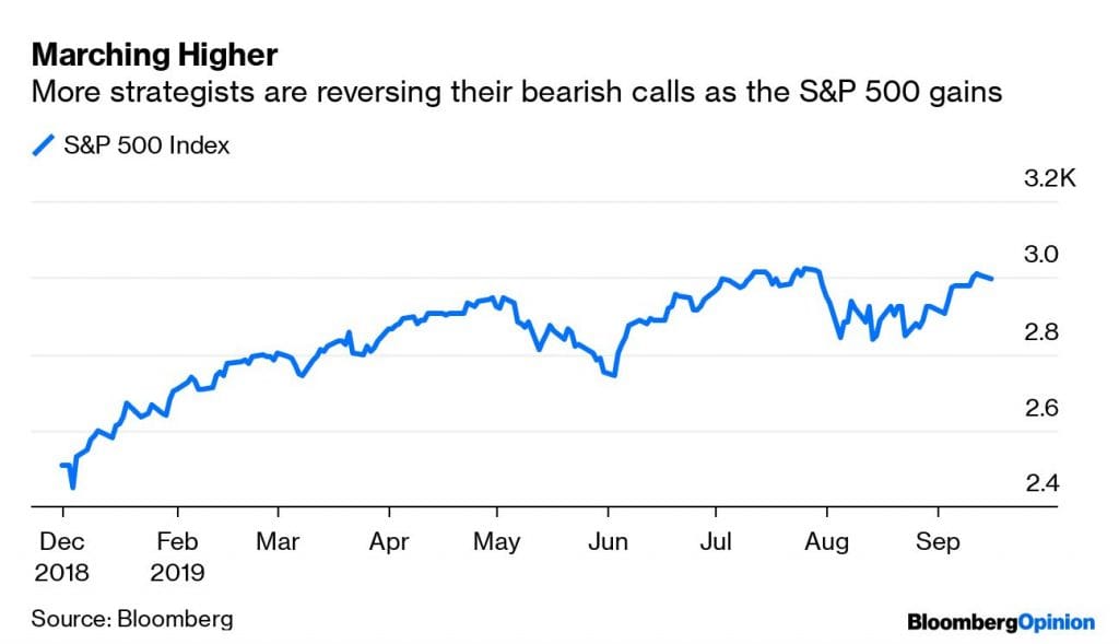 It didn’t receive a lot of attention, perhaps because the news broke late Friday after markets had closed and then the Saudi oil attacks happened, but one prominent bear on the stock market has capitulated. Tobias Levkovich, Citigroup Inc.’s chief U.S. equity strategist, raised his year-end target for the S&P 500 Index to 3,050 from 2,850, going from the fourth-bearish among Wall Street prognosticators tracked by Bloomberg to one of the few who still see gains for the rest of 2019, according to Bloomberg News’s Lu Wang. The new target represents a 1.4% increase from Friday’s closing level of 3,007.39. Levkovich’s newfound optimism is built on a scenario in which a glut of supply has dwindled, setting the stage for a recovery in production. Industries such as semiconductors have suffered profit declines amid excessive inventory, and earnings among S&P 500 companies are expected to fall 3% in the third quarter before rebounding to a growth pace of 3.8% in the fourth, analyst estimates compiled by Bloomberg showed. “A required inventory correction is ending, with production likely to pick up modestly just to meet end-market demand,” Levkovich wrote in a note to clients. As a result, fourth-quarter “earnings estimates may not need additional trimming.” Wang notes how strategists have been forced to play catch up with a market that has risen about 20% this year. Based on the last Bloomberg survey in mid-August, all but six of 21 strategists have seen the benchmark exceed their year-end targets.