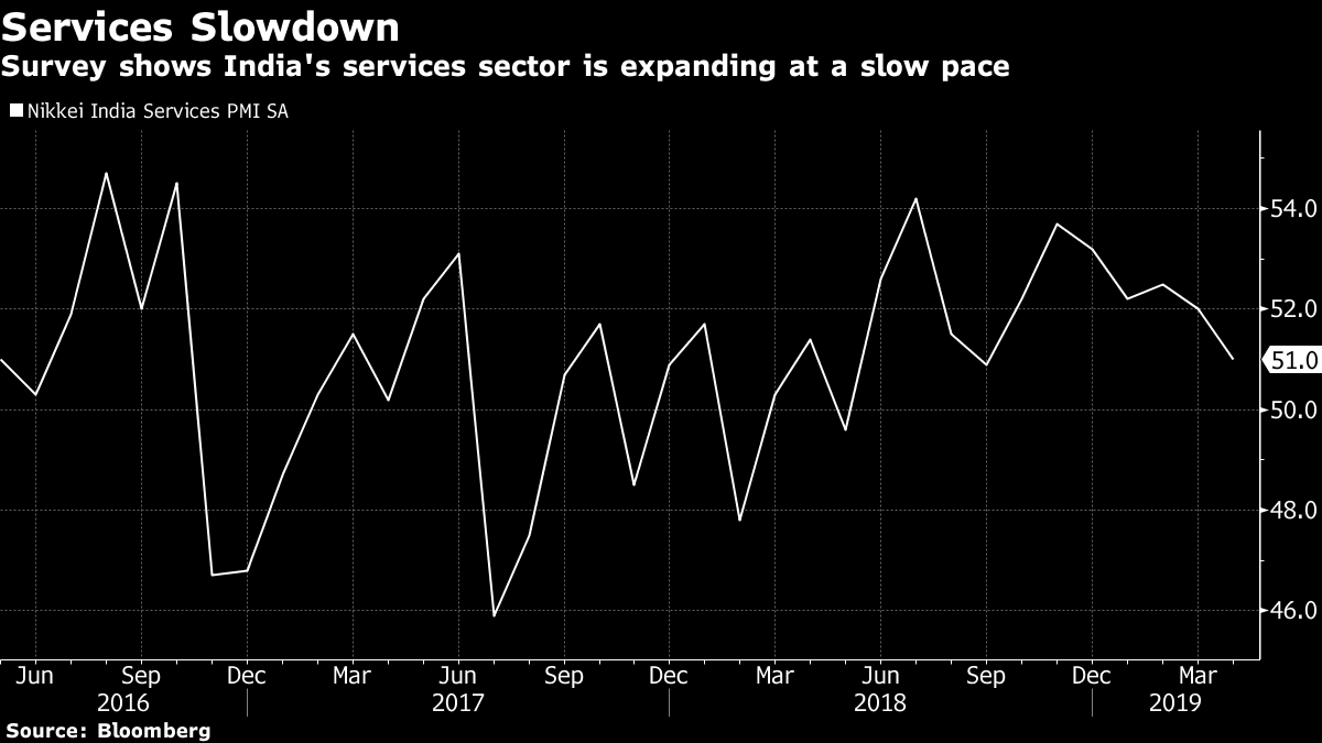 The Nikkei India services purchasing managers’ index fell to a seven-month low of 51 in April from 52 in the previous month on the back of slower increases in new business and output growth. A survey last week showed manufacturing also weakened in April.