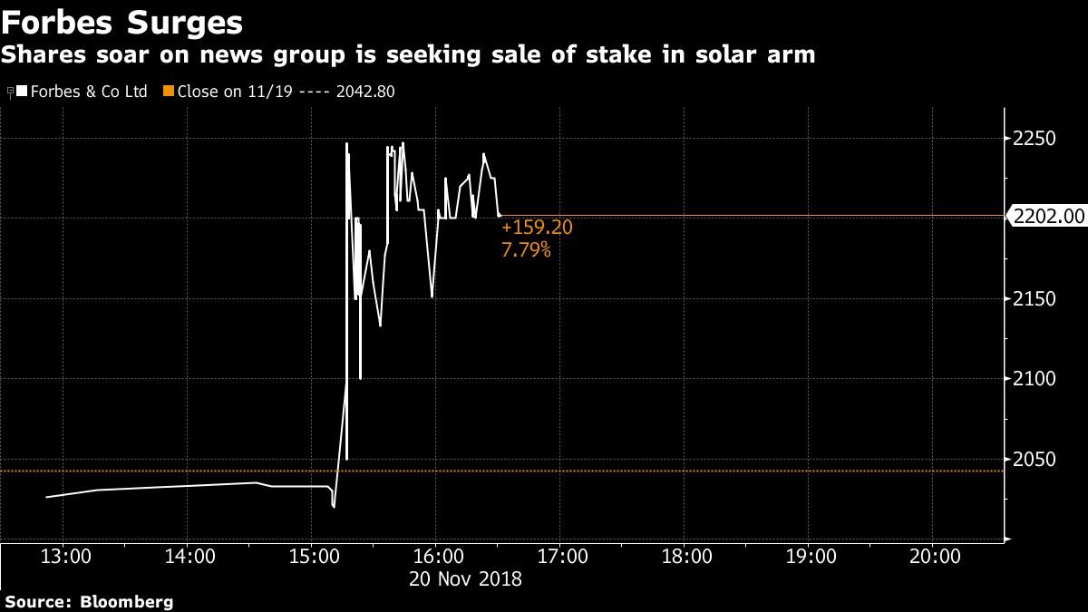 Forbes & Co. shares surged 10 percent, the most since April 6, to 2,247.1 rupees in Mumbai, paring this year’s decline to 53 percent. Benchmark S&P BSE Sensex fell 0.8 percent.