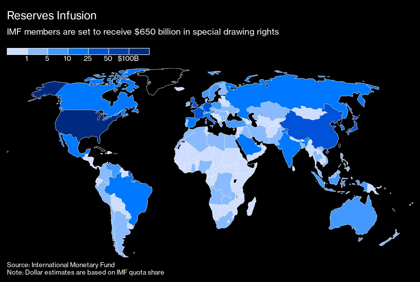 Reserves are allocated to all 190 members of the IMF in proportion to their quota, and some 70% will go to the Group of 20 largest economies, with just 3% for low-income nations. Overall, 58% of the new SDRs go to advanced economies, with 42% for emerging and developing economies. So of the $650 billion, about $21 billion go to low-income countries and $212 billion to other emerging market and developing countries, without counting China, according to U.S. Treasury Department calculations.