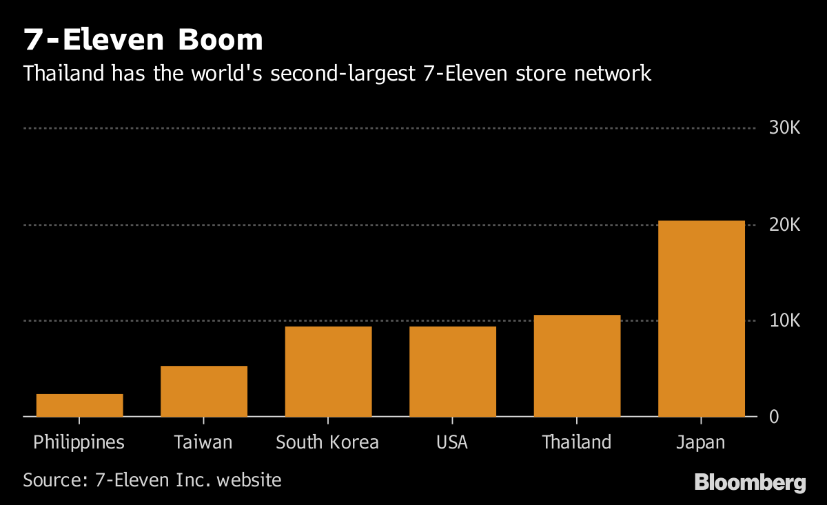 CP All operates more than 10,000 7-Eleven stores in Thailand, the most outlets after Japan, according to 7-Eleven Inc.’s website.