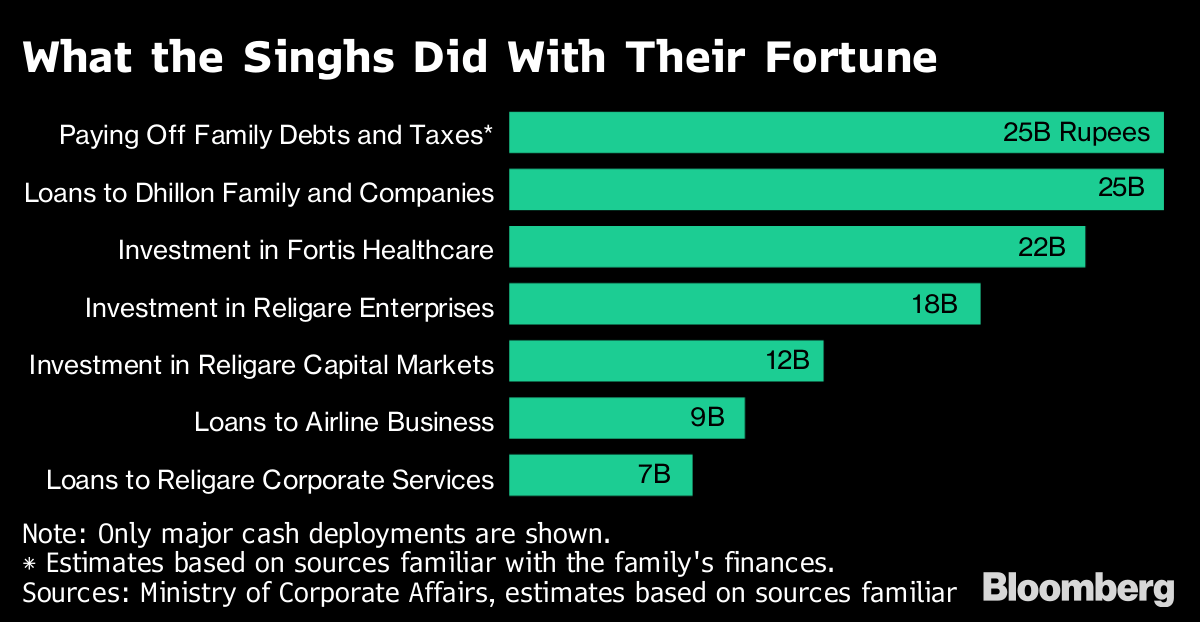 Over the years, the brothers’ main holding company loaned about Rs 2,500 crore ($360 million) to the Dhillon family and property businesses largely controlled by them, according to documents and people familiar with the matter. Some of those outlays were financed with money borrowed from the Singhs’ listed companies, and when combined with other Singh investments gone bad threw their empire into a debt spiral, a Bloomberg News analysis of public records and interviews with 10 people familiar with the finances of both camps showed.