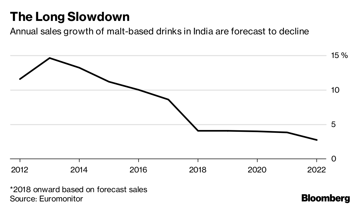 Annual sales growth of malt-based drinks in India are forecast to decline
