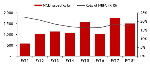 Exhibit 5: Even with declining RoE, the issuance of NCDs by NBFCs has gained momentum