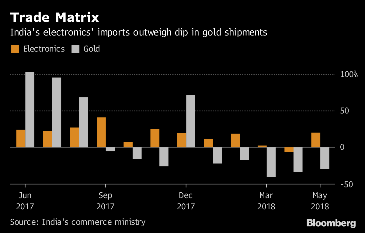In the aftermath of taper-tantrums in 2013, India hiked import duty on gold bullion and jewelry. That saw inflows shrink, helping narrow the current-account gap. This time around, electronics imports have outstripped gold.