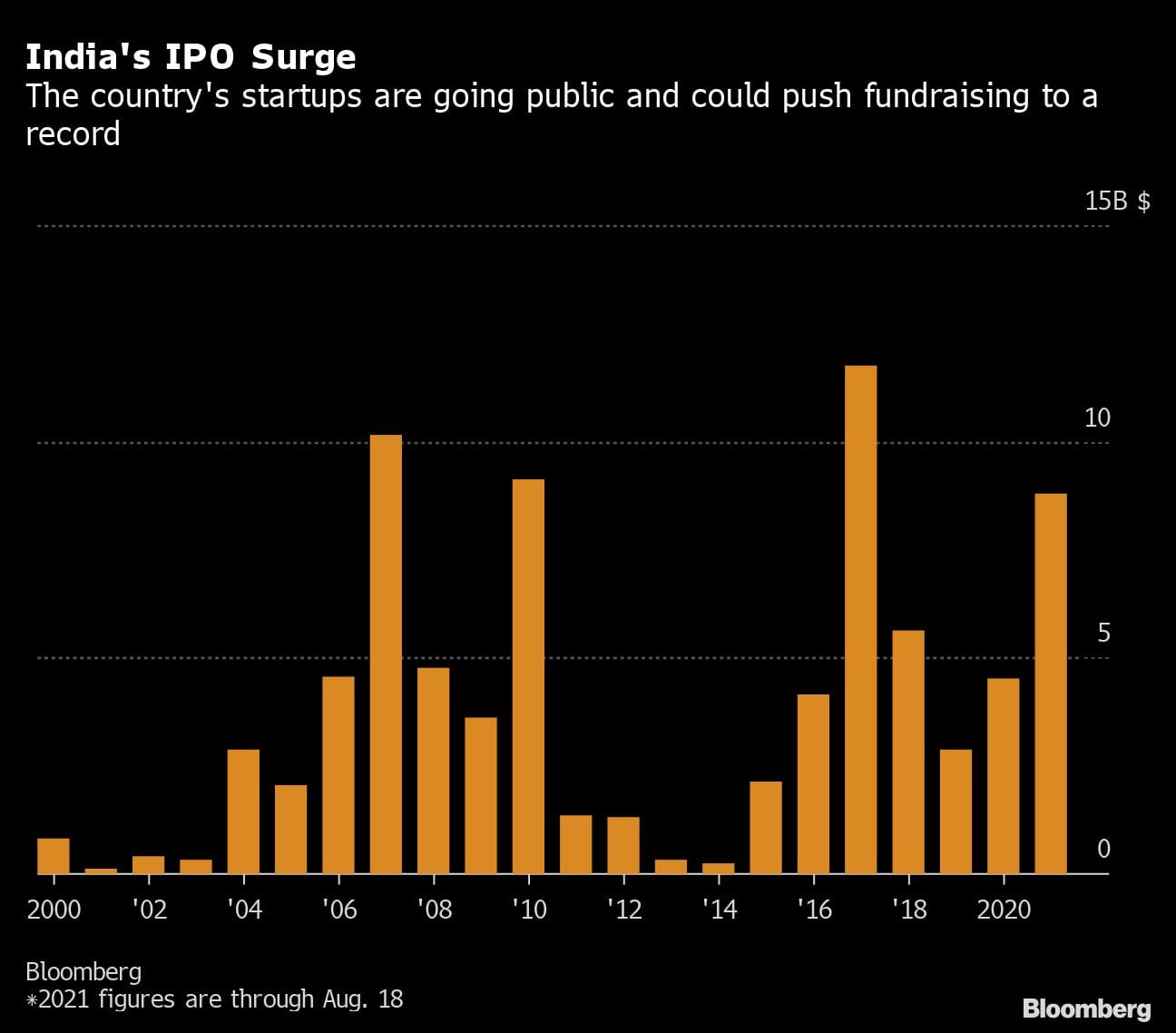 Global investors like Fidelity Investments, KKR & Co. and Singapore’s Temasek Holdings Pte have pumped money into India, while China’s crackdown on private enterprise has spooked financiers. The value of venture investments in India reached $7.9 billion in July, surpassing China for the first time on a monthly basis since 2013, according to researcher Preqin Ltd.