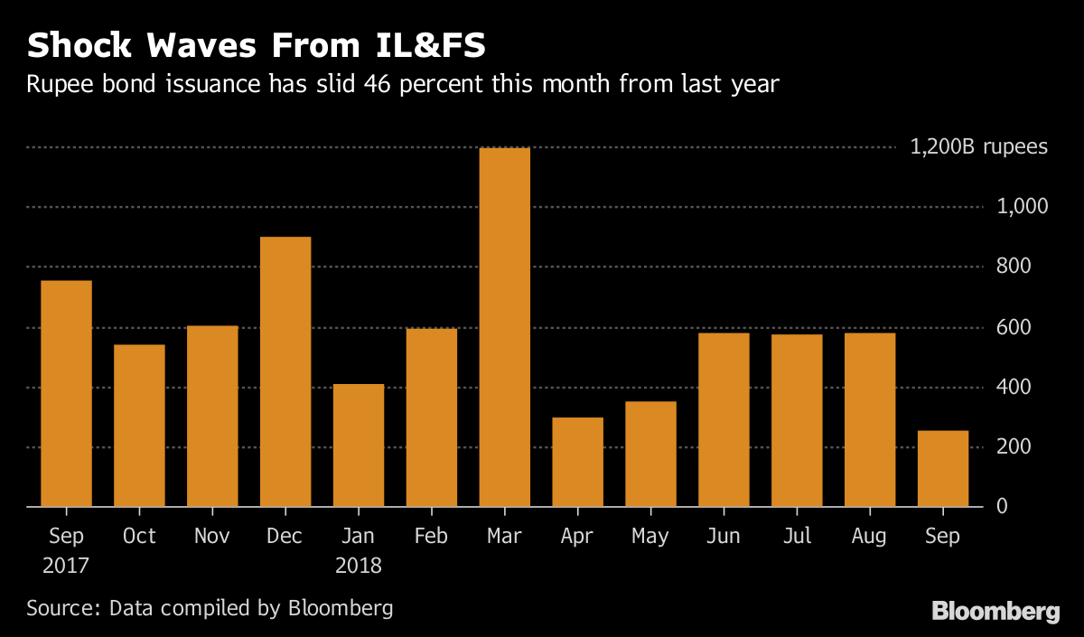 The fear added to pressure on borrowing costs for all companies in India’s credit market, led to a slump in corporate bond issuance and sparked a brief but sharp sell-off in equities. There was also concern that the group’s troubles could spread to other shadow banks and crimp Prime Minister Narendra Modi’s infrastructure plans before elections next year.