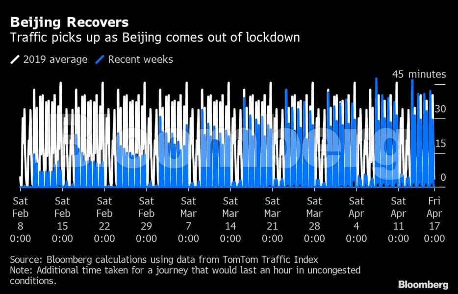 Beijing and other Chinese cities provide the clearest data on how a place recovers from lockdown imposed to fight the Covid-19 virus. The chart below shows that journey times have risen slowly over recent weeks, as more and more traffic returns to the city’s roads. By last week, it looks as though gridlock had returned to Beijing, with journeys taking just as long as they did on average last year.