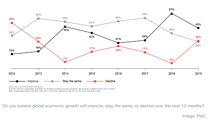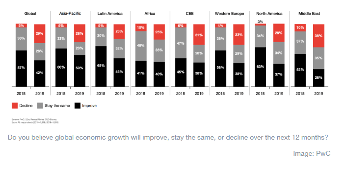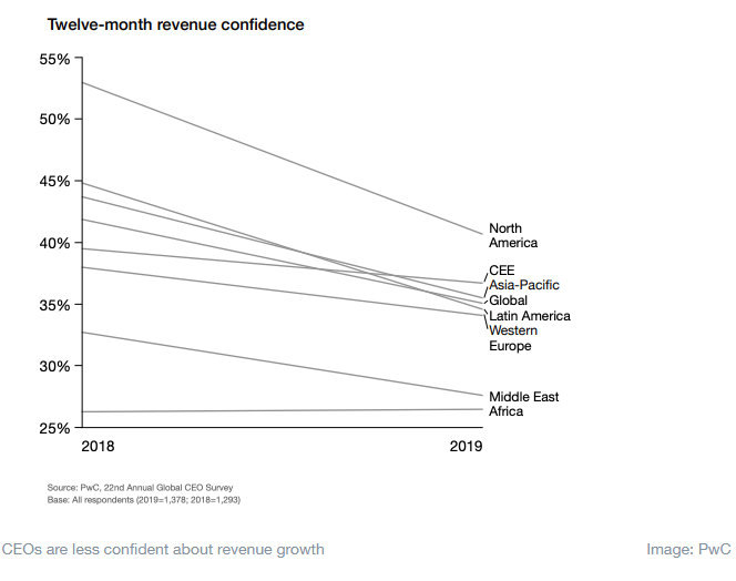 The trend toward pessimism is fairly uniform, regardless of region – from 23% in Latin America to 38% in the Middle East. North America saw the largest fall in the number of CEOs expecting things to improve, from 63% last year to 37% this year. While there are many factors at play here, there is one to pay particular heed of, the report’s authors say.