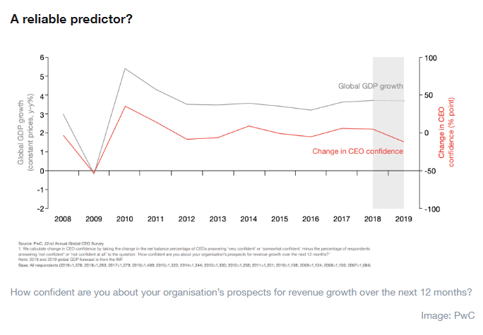 An interesting trend reveals itself when looking at the results of the last 10 years’ of CEO Survey responses. It transpires that global CEO attitudes toward their own organization’s performance are quite accurate at forecasting the state of the global economy over the coming 12 months.