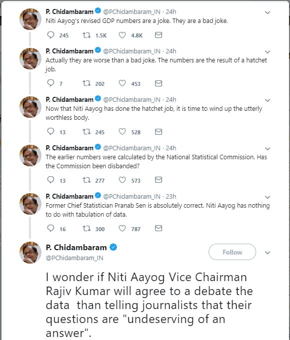 The data has led to accusations that it has been tinkered with and has a sparked a political battle, with former finance minister P. Chidambaram slamming the revised GDP numbers as being a “joke”.