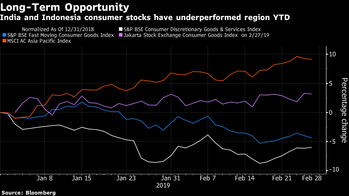 Consumer-related stocks have underperformed broader equity gauges in these Asian emerging markets so far this year. Still, the S&P BSE Fast Moving Consumer Goods Index is trading at 32 times expected 12-month earnings and the Jakarta Consumer Goods Index at 27 times, both just under double the valuations for their respective country benchmarks.