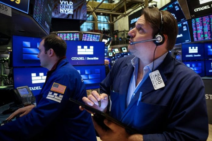 NEW YORK (Reuters) – U.S. stocks turned lower and the dollar strengthened on Thursday as investors weighed solid data against notes of caution from world central bank leaders regarding mounting economic uncertainties stemming from U.S. President Donald Trump’s erratic tariff policies.