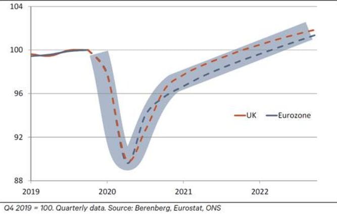 “The sharp downturn will be followed by a slightly flatter upturn that ultimately goes beyond the pre-coronavirus level of GDP,” Holger Schmieding and Kallum Pickering, economists at Berenberg Bank, said in a report. “By and large, we expect GDP to surpass its late-2019 level roughly two years after the trough.”- Bloomberg