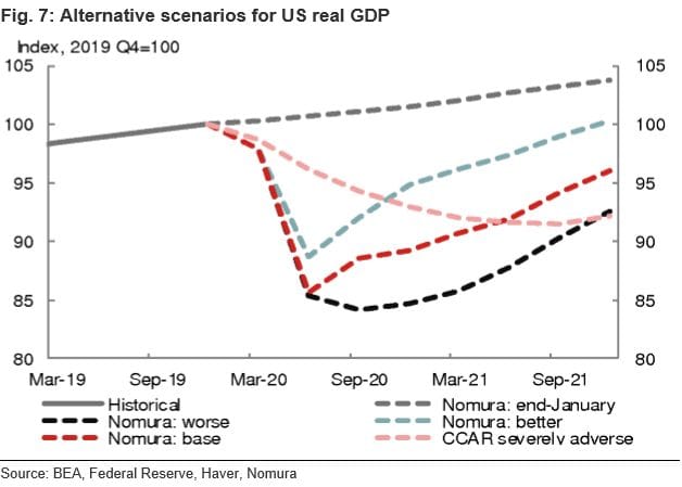At Nomura Holdings, economists led by Rob Subbaraman say an L-shape would be their worst-case scenario in the U.S. Erik Britton of Fathom Consulting says a prolonged slump will be hard to avoid if Covid-19 returned, meaning the outlook is either a ‘V’ or an ‘L’ with not much in between.