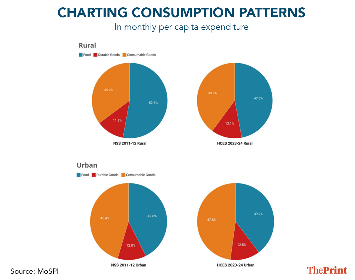 Rural food expenditure dropped from 52.9 percent in 2011-12 to 47 percent in 2023-24, and in urban areas, food spending declined from 42.6 percent to 39.7 percent.