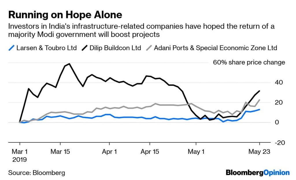 Shares of construction and transport companies such as Larsen & Toubro Ltd., Dilip Buildcon Ltd. and Adani Ports & Special Economic Zone Ltd. have risen sharply this year on hopes of a “New India.” The reality for infrastructure companies is that Old India will be around for a while longer.
