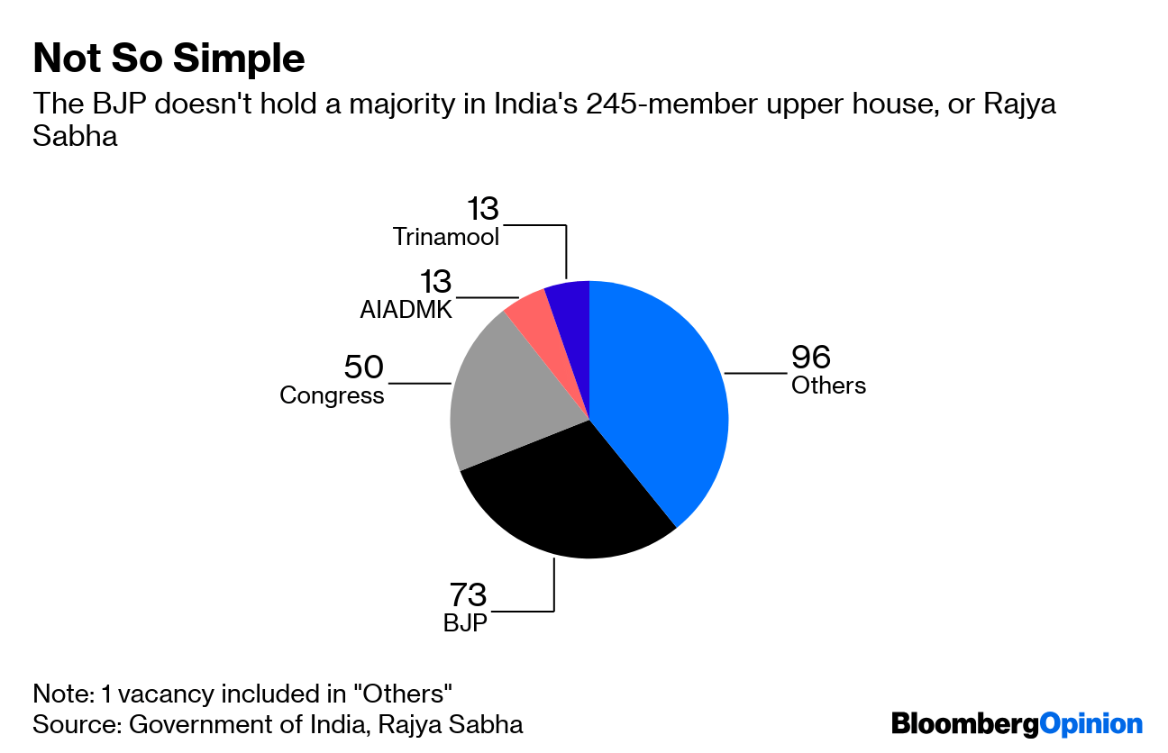 Despite the impressive show Modi and his party put up in the lower-house elections, they don’t have a majority in the upper house of India’s parliament. Numbers move more slowly in the Rajya Sabha, with a third of members retiring every two years. That means that passing legislation such as a land-acquisition bill, which is crucial to speed up infrastructure development, will remain a tough ask until at least 2020.