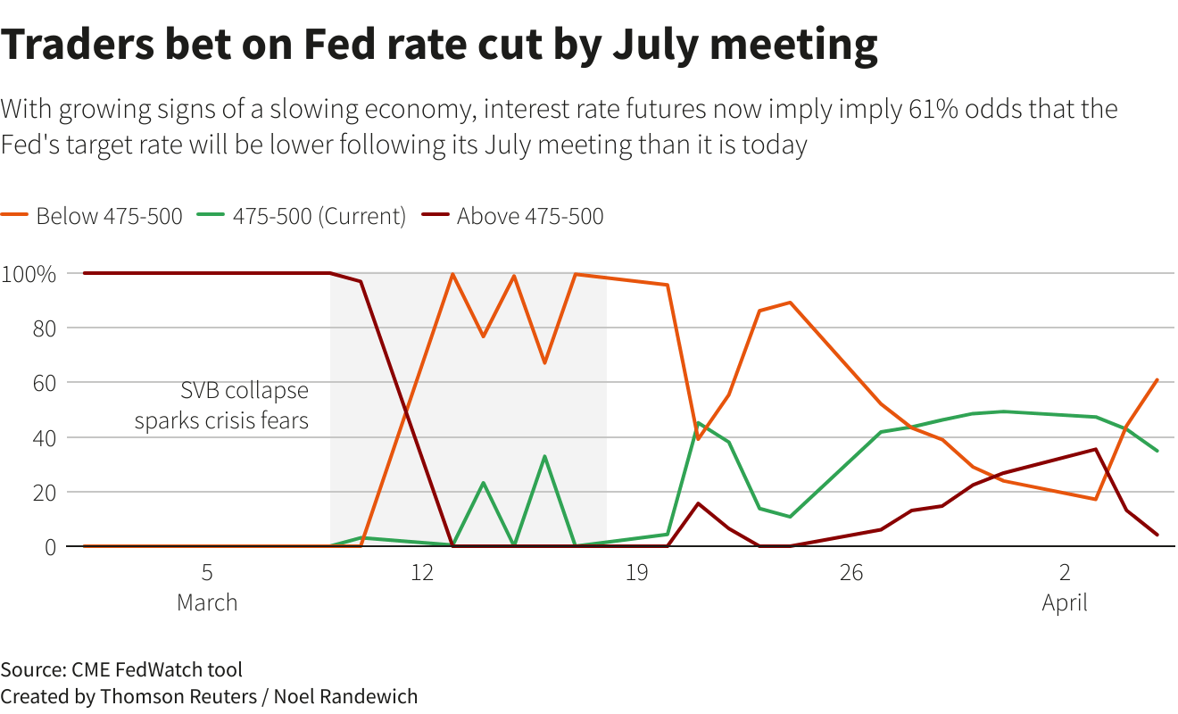 At last glance, financial markets are pricing in a 57% likelihood that the central bank will let its key interest rate stand at its still-restrictive 4.75%-5.00% range at the conclusion of its next policy meeting in May, according to CME’s FedWatch tool.